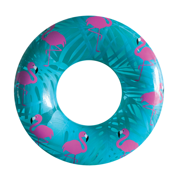 Have some fun in the sun with our Flamingo Swim Ring! The baby blue and clear innertube with Flamingo design is sure to make any pool day extra fun!